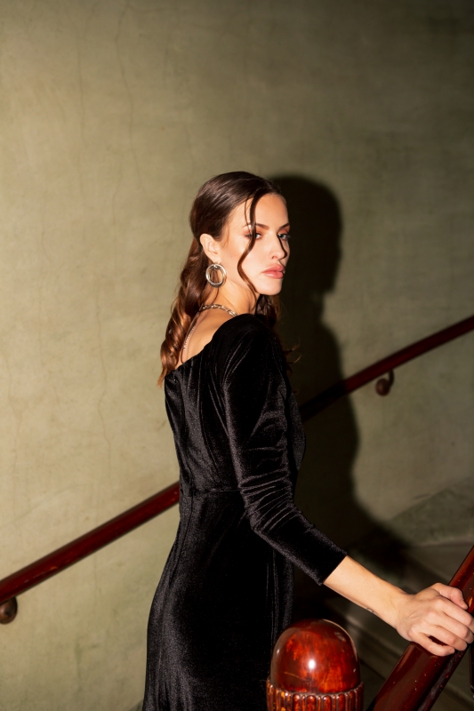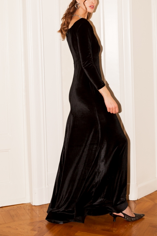 En elegant sammetsklänning med en vacker passform. Klänningen finns i storlek 34 - 44.Färg Svart95% Polyester, 5% SpandexStor i storlek så rekommenderar en storlek mindre än vad ni brukar ha.