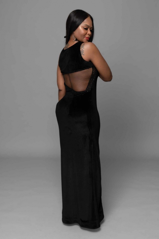 Vacker sammetsklänning med pärltyg som vackert markerar midjan och med en vacker rygg.Sys upp på beställning efter dina egna mått i vår atelje i Midsommarkransen, Stockholm. Utförandet tar ca 1-2veckor.